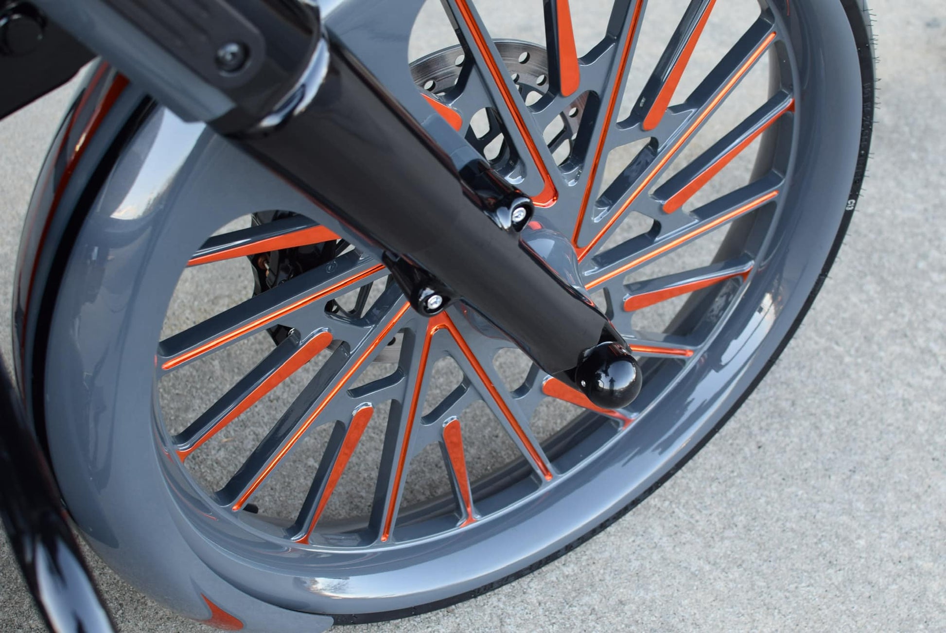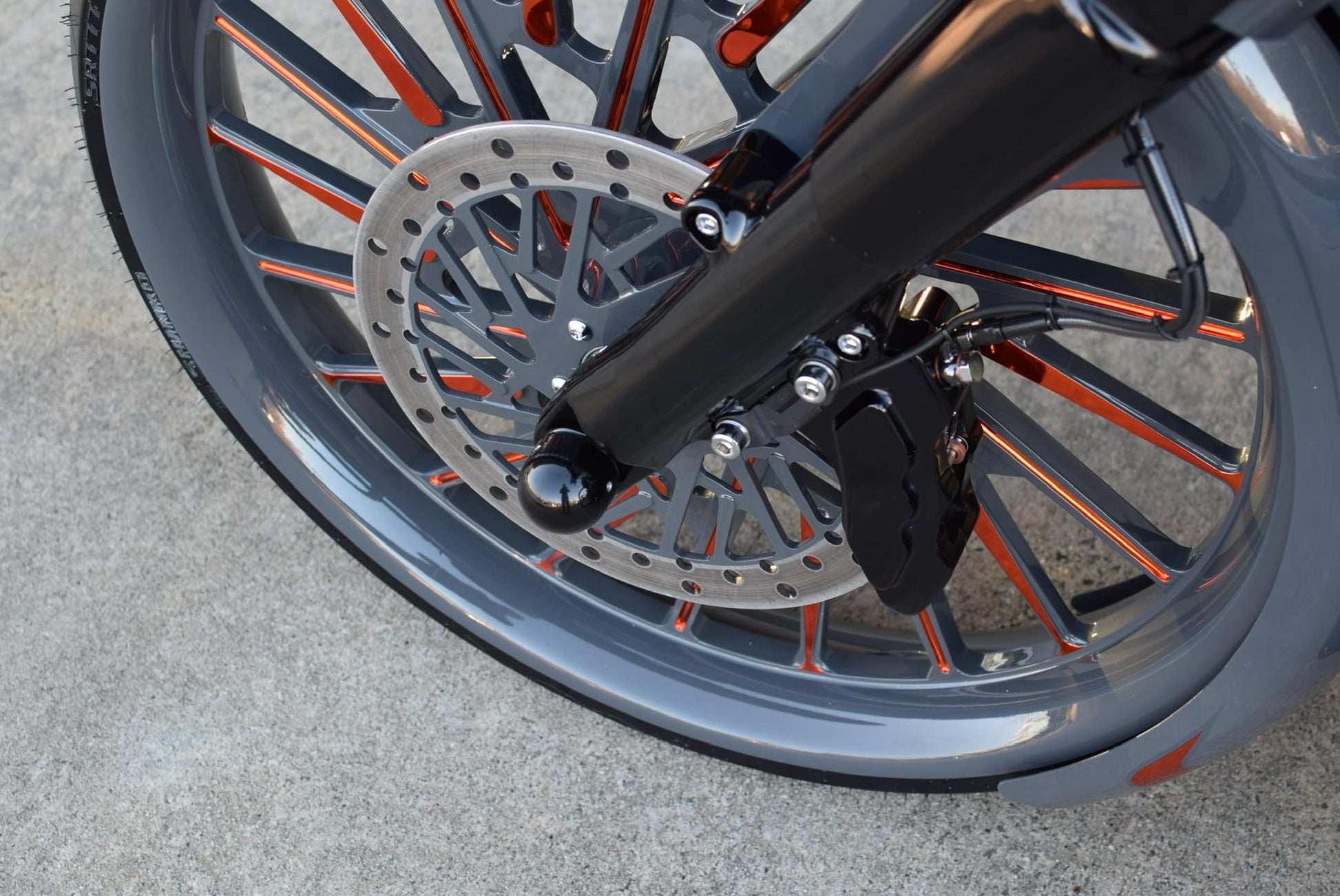 Custom Gunship Grey & Candy Orange Paint Job, VIP 26” Front Wheel with Matching 18” Rear, American Suspension Bolt on Neck kit, Front & Rear Air Ride System, Electric Center Stand, Top Shop Black Death Kit, Custom Seat, Custom Audio, Fully Blacked Out Engine Kit, PM Floorboard & Peg Series & More! Over $35K in Custom Options! Stunning Machine!!