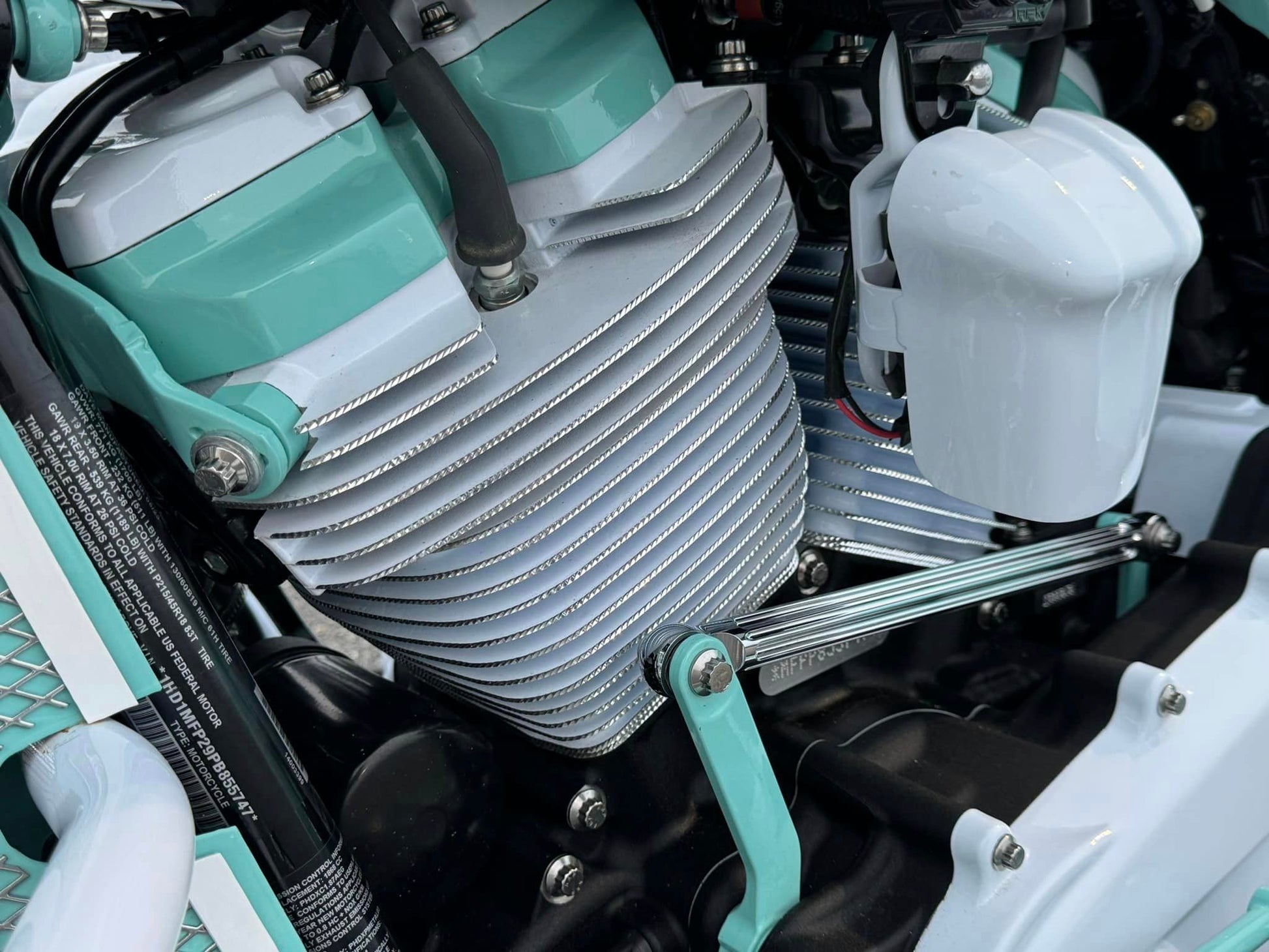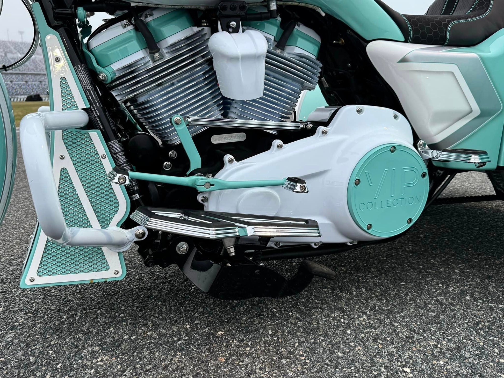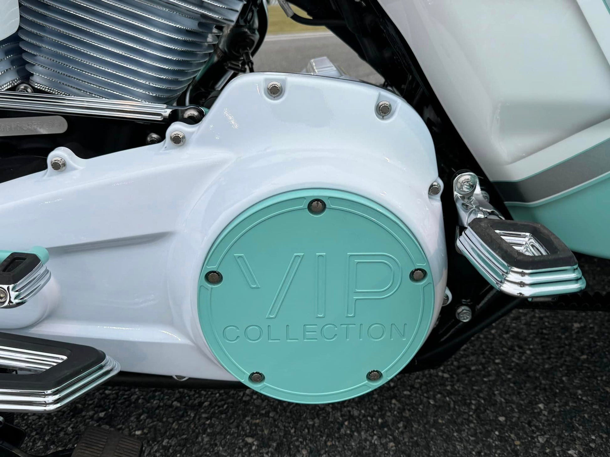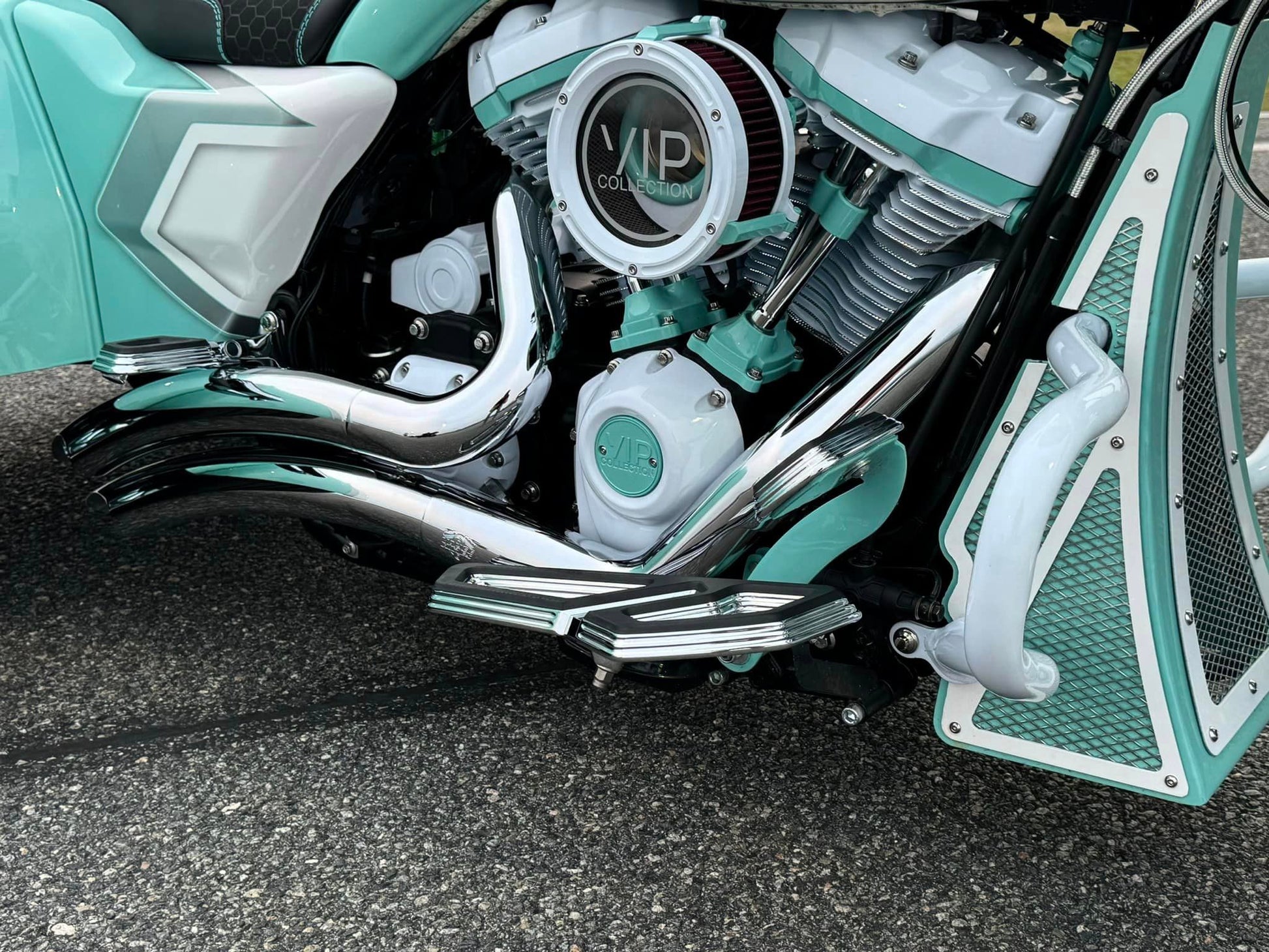 Custom Tiffany Blue & White Stunning Paint Job, White Cylinders with Diamond Cut Heads, VIP “GIA” 26” Chrome, White & Tiffany Blue Front Wheel, Dual VIP 20x10” Chrome, White & Tiffany Blue Rear Wheels, Custom 10” Wide One of a Kind Rear Fenders, American Suspension Bolt on Neck kit, Front & Rear Air Ride System, Top Shop Stretched Tank, L.E.D. Headlight, Push Button Start, Custom Seat, Custom White & Tiffany Blue Engine Kit, Chrome Empire Floorboard, Brake, Heel/Toe Pkg, Chrome Smooth Style American Suspension Front End Kit, Chrome & Tiffany Blue B62 Brake Calipers, Chrome Vance & Hines Big Radius Exhaust, White & Tiffany Blue Trask “Assault” Breather, Custom Chrome 12” Bagger Bars with Chrome Controls & Buttons, Custom Raked Chin Spoiler, Custom 12 pt ARP Bolt Pkg & More!