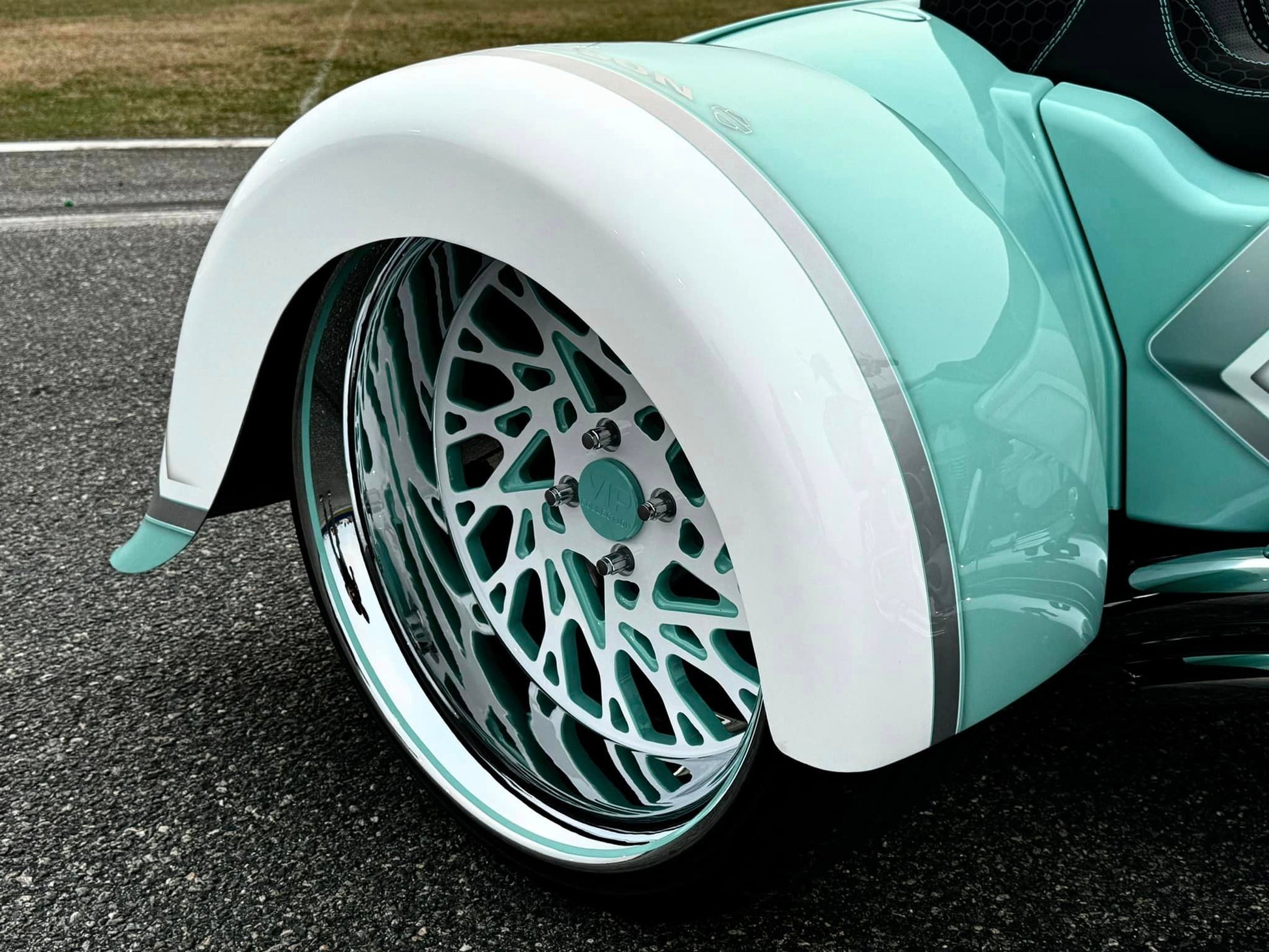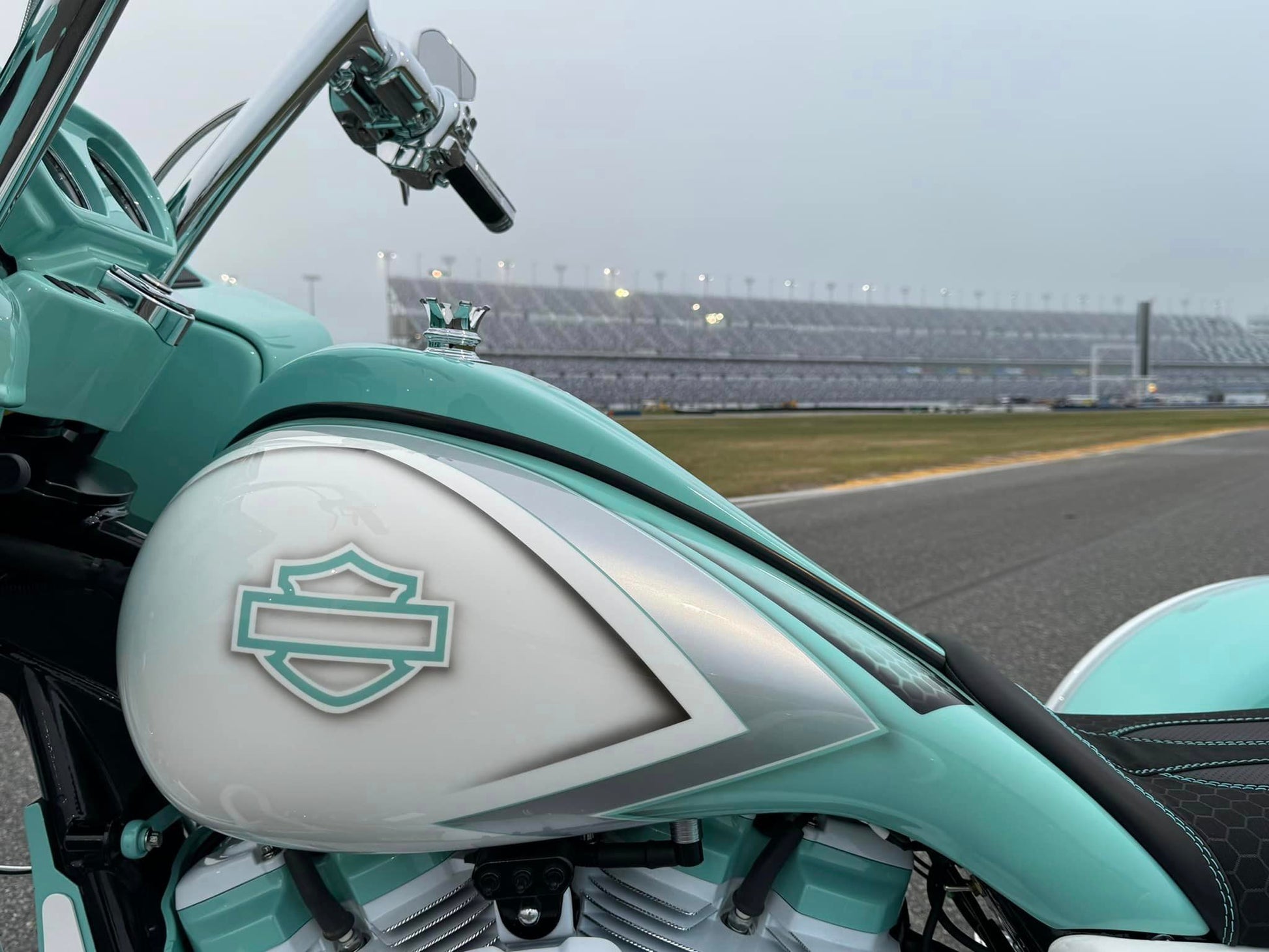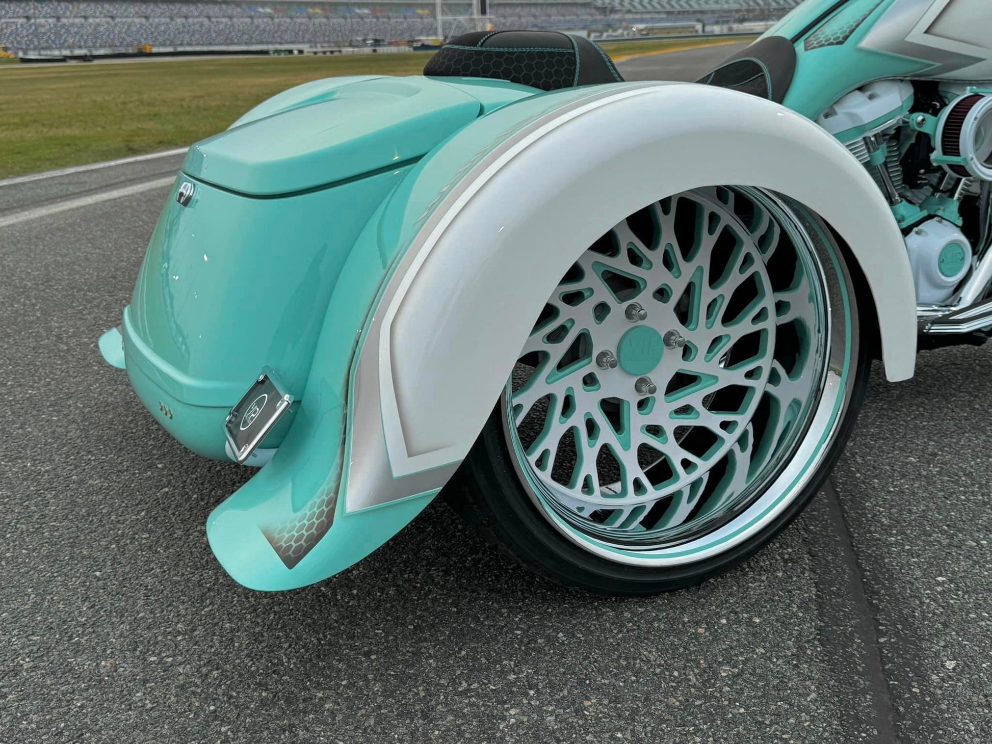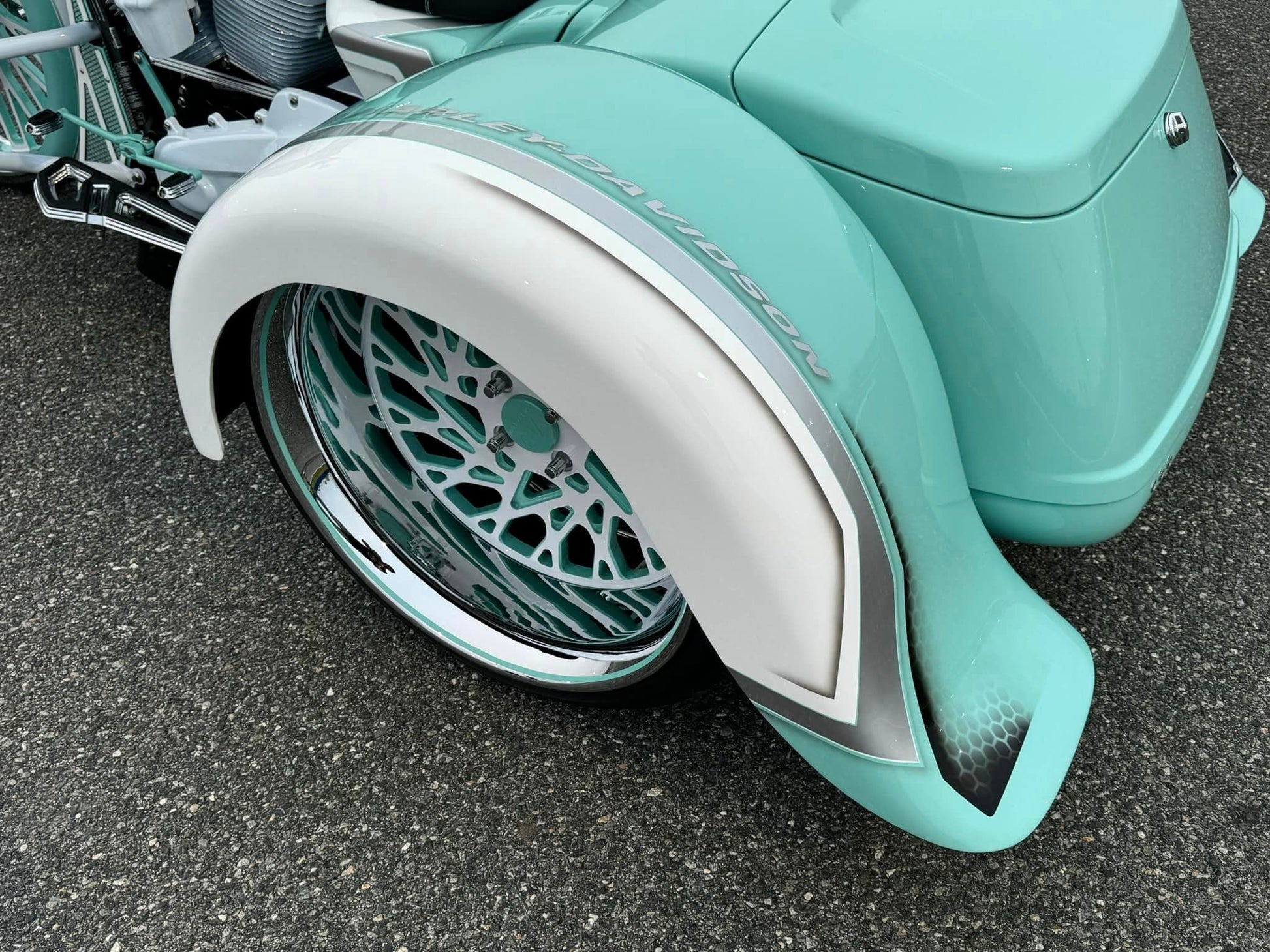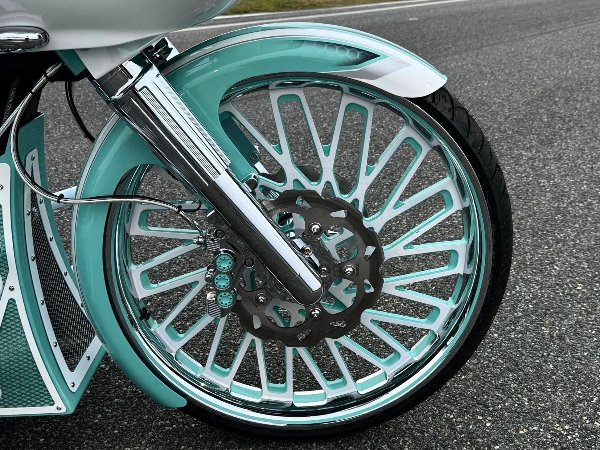 Custom Tiffany Blue & White Stunning Paint Job, White Cylinders with Diamond Cut Heads, VIP “GIA” 26” Chrome, White & Tiffany Blue Front Wheel, Dual VIP 20x10” Chrome, White & Tiffany Blue Rear Wheels, Custom 10” Wide One of a Kind Rear Fenders, American Suspension Bolt on Neck kit, Front & Rear Air Ride System, Top Shop Stretched Tank, L.E.D. Headlight, Push Button Start, Custom Seat, Custom White & Tiffany Blue Engine Kit, Chrome Empire Floorboard, Brake, Heel/Toe Pkg, Chrome Smooth Style American Suspension Front End Kit, Chrome & Tiffany Blue B62 Brake Calipers, Chrome Vance & Hines Big Radius Exhaust, White & Tiffany Blue Trask “Assault” Breather, Custom Chrome 12” Bagger Bars with Chrome Controls & Buttons, Custom Raked Chin Spoiler, Custom 12 pt ARP Bolt Pkg & More!